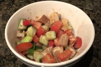 After a summer break, I’m back with more recipes! This yummy salad is filling, flavorful, and easy!